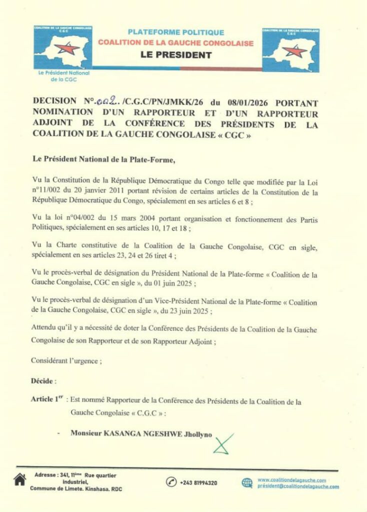 Cette décision, signée le 08 janvier 2026 par le Président national de la C.G.C, rend officielle la désignation de Jhollyno Kasanga en qualité de rapporteur de la Conférence des présidents.